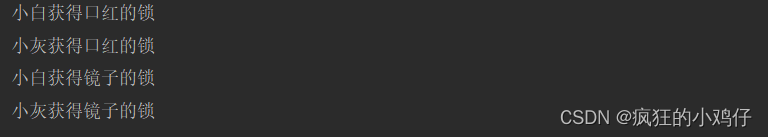 //死锁:多个线程抱着对方需要的资源,然后形成僵持。public class TestLock { public static void main(String[] args) { Makeup g1 = new Makeup(0,"小白"); Makeup g2 = new Makeup(1,"小灰"); g1.start(); g2.start(); }}//口红class Lipstick{}//镜子class Mirror{}class Makeup extends Thread { //需要的资源只有一份,用static来保证只有一份 static Lipstick lipstick = new Lipstick(); static Mirror mirror = new Mirror(); int choice; //选择 String girlName;//使用化妆品的人 Makeup(int choice, String girlName) { this.choice = choice; this.girlName = girlName; } @Override public void run() { //化妆 try { makeup(); } catch (InterruptedException e) { e.printStackTrace(); } } //化妆,互相持有对方的锁,就是需要拿到对方的资源 private void makeup() throws InterruptedException { if (choice == 0) { synchronized (lipstick) {//获得口红的锁 System.out.println(this.girlName + "获得口红的锁"); Thread.sleep(1000); } synchronized (mirror) {//一秒钟后获得镜子的锁 System.out.println(this.girlName + "获得镜子的锁"); } } else { synchronized (mirror) {//获得镜子的锁 System.out.println(this.girlName + "获得口红的锁"); Thread.sleep(2000); }synchronized (lipstick) {//一秒钟后获得口红的锁 System.out.println(this.girlName + "获得镜子的锁"); } } }} 运行结果:
