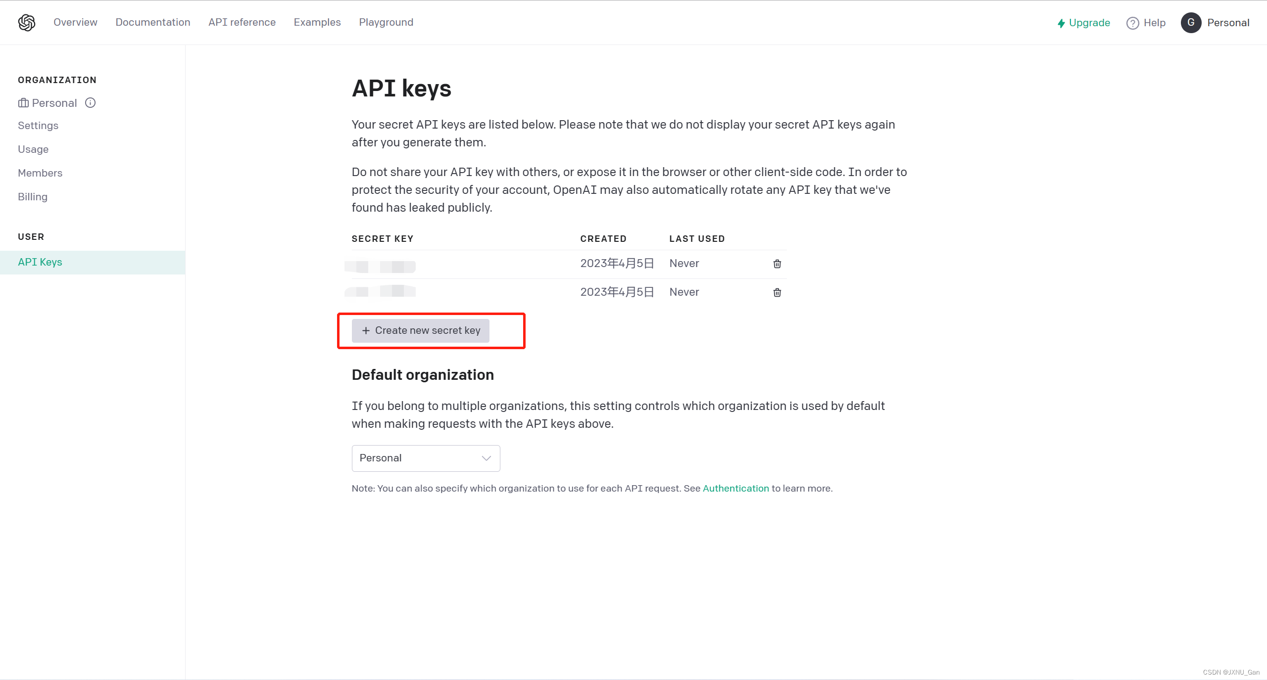 使用OpenAI账号登入:OpenAI登入后选择View API keys -> API Keys页面。