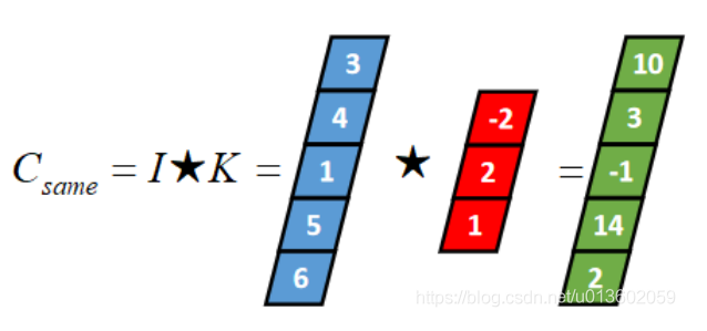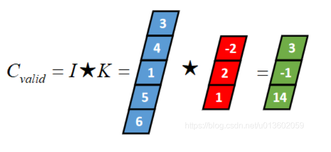 一维卷积通常有三种类型:full卷积、same卷积和valid卷积,下面以一个长度为5的一维张量I和长度为3的一维张量K(卷积核)为例,介绍这三种卷积的计算过程。