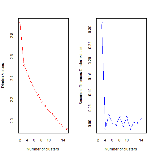 ## *** : The Hubert index is a graphical method of determining the number of clusters.## In the plot of Hubert index, we seek a significant knee that corresponds to a ## significant increase of the value of the measure i.e the significant peak in Hubert## index second differences plot. ##