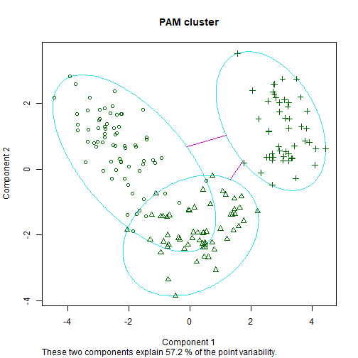 K均值聚类是基于均值的,所以对异常值很敏感。一个更稳健的方法是围绕中心点的划分(PAM)。用一个最有代表性的观测值代表这一类(有点类似于主成分)。K均值聚类一般使用欧几里得距离,而PAM可以使用任意的距离来计算。因此,PAM可以容纳混合数据类型,并且不仅限于连续变量。