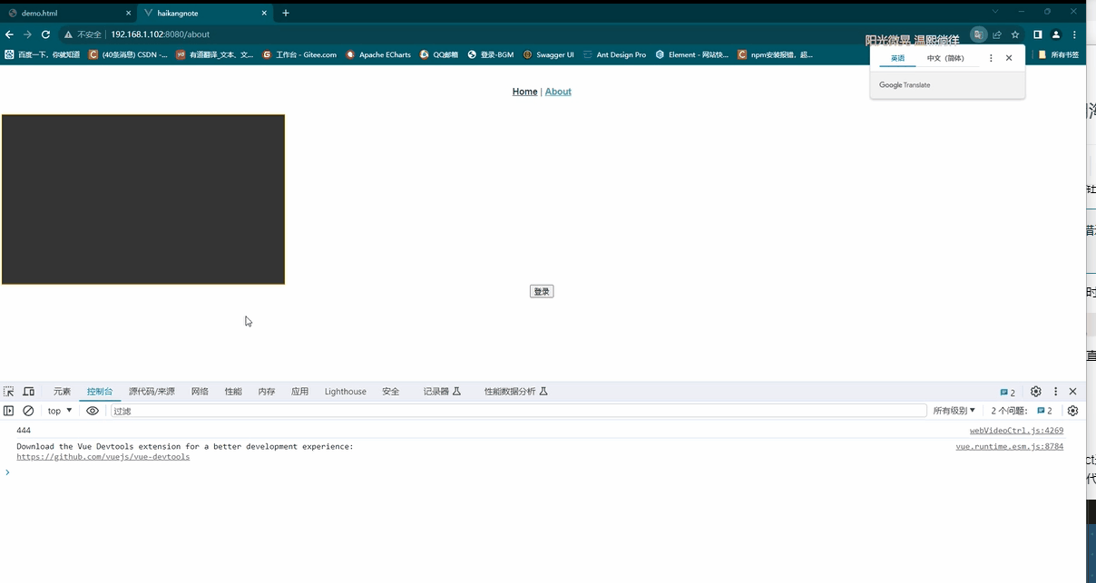我们可以看到当页面切换的时候我们的监控窗口还在页面上(这样肯定是不行的,毕竟在项目中切换到别的页面之后监控窗口还在的话那就出大麻烦了),并且当我们切换回去的时候窗口的预览图像不见了,并且我们再点击登录按钮的时候报错,提示我们这个驱动已经登录了