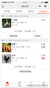 农产品评论:在“我的订单”列表中,已经付款的订单,可以对每个农产品,点击“评价”,去打分和填写商品评论.