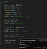 int main(){LTNode* phead = LTInit();LTPushBack(phead, 1);LTPushBack(phead, 2);LTPushBack(phead, 3);LTPushFront(phead, 4);LTPushFront(phead, 100);LTPrint(phead);//100->4->1->2->3->LTPopFront(phead);LTPopBack(phead);LTPrint(phead);//4->1->2->LTNode* ret = LTFind(phead, 2);LTInsert(ret, 120);LTPrint(phead);//4->1->2->120->LTErase(ret->next);LTPrint(phead);//4->1->2->LTDestroy(phead);return 0;}
