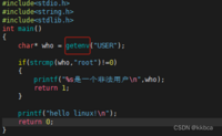 我们也可以使用C语言的getenv参数来获取环境变量,如下就是一种例子,判断必须是root用户才可以继续执行,否则就报错非法用户并退出。