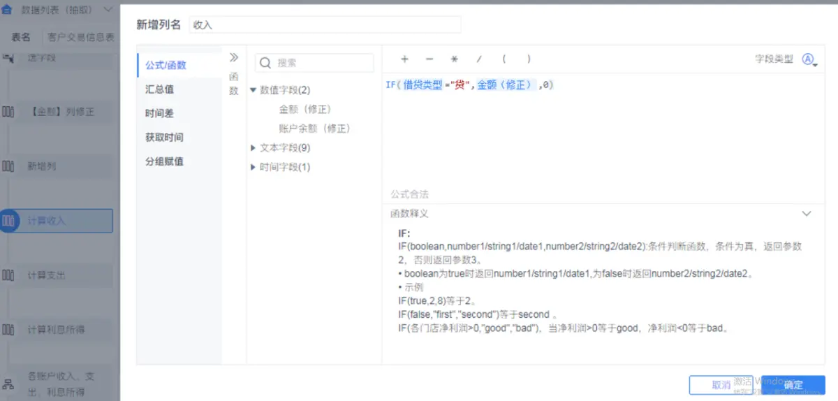 【收入】:借贷类型="贷"的记录,金额保留,否则赋值为0