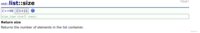 // list::size#include <iostream>#include <list>int main (){ std::list<int> myints; std::cout << "0. size: " << myints.size() << '\n'; for (int i=0; i<10; i++) myints.push_back(i); std::cout << "1. size: " << myints.size() << '\n'; myints.insert (myints.begin(),10,100); std::cout << "2. size: " << myints.size() << '\n'; myints.pop_back(); std::cout << "3. size: " << myints.size() << '\n'; return 0;}
