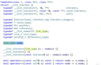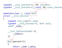 template<class T,class Ref,class Ptr>struct __list_iterator{typedef list_node<T> node;typedef __list_iterator<T, Ref,Ptr> self;node* _node;__list_iterator(node* n):_node(n){}Ref& operator*(){return _node->_data;}self operator++(){_node = _node->_next;return *this;}self operator++(int){self tmp(_node);_node = _node->_next;return tmp;}self operator--(){_node = _node->_prev;return *this;}self operator--(int){self tmp(_node);_node = _node->_prev;return tmp;}Ptr operator->(){return &_node->_data;}bool operator!=(const self& s){return _node != s._node;}bool operator==(const self& s){return _node == s._node;}};