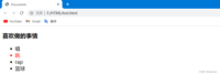 <style> li:nth-child(2) { color: red; }</style><body> <h3>喜欢做的事情</h3> <ul> <li>唱</li> <li>跳</li> <li>rap</li> <li>篮球</li> </ul></body>