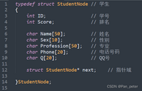 #pragma once#include <stdio.h>#include <stdlib.h>#include <assert.h>typedef int STDateTypeOne;typedef char STDateTypeTow;// 学生 typedef struct StudentNode{int ID; // 学号int Score; // 排名 char Name[50]; // 姓名char Sex[10]; // 性别char Profession[50]; // 专业char Phone[20]; // 电话号码char Q[20]; // QQ号 struct StudentNode* next; // 指针域}StudentNode;// 主菜单界面void myMenu();// 退出系统void exit(); // 命令有误void error(); // ----------------------------------CRUD模块void AddStudent(StudentNode** s); // 添加 void DeleteStudent(StudentNode** s); // 删除void UpdateStudent(StudentNode** s); // 更新void SearchStudent(StudentNode** s); // 查询// ----------------------------------其他模块 void MyPrint(StudentNode* s); // 输出学生信息 (打印所有学生信息) void MySort(StudentNode** s); // 排序学生信息 (按照学号升序排序) student.cpp