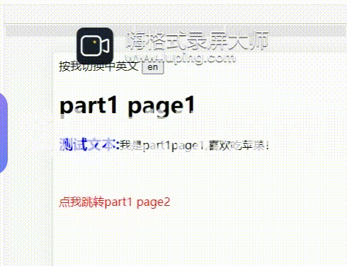 import Vue from 'vue'import VueRouter from 'vue-router'import part1page1 from '@/views/part1/page1'import part1page2 from '@/views/part1/page2'import part2page1 from '@/views/part2/page1'Vue.use(VueRouter)const routes = [ { path: '/', component: part1page1 }, { path: '/part1page2Router', component: part1page2 }, { path: '/part2page1Router', component: part2page1 }]const router = new VueRouter({ routes})export default router 步骤四:编写翻译文件