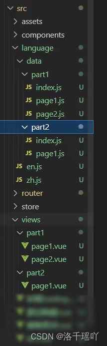 npm i vue-i18n@8.23.0 步骤二:创建基本目录(language文件夹是翻译的数据文件,views文件夹下的是页面,part1和part2代表项目的不同模块,每个模块下都有对应的页面)