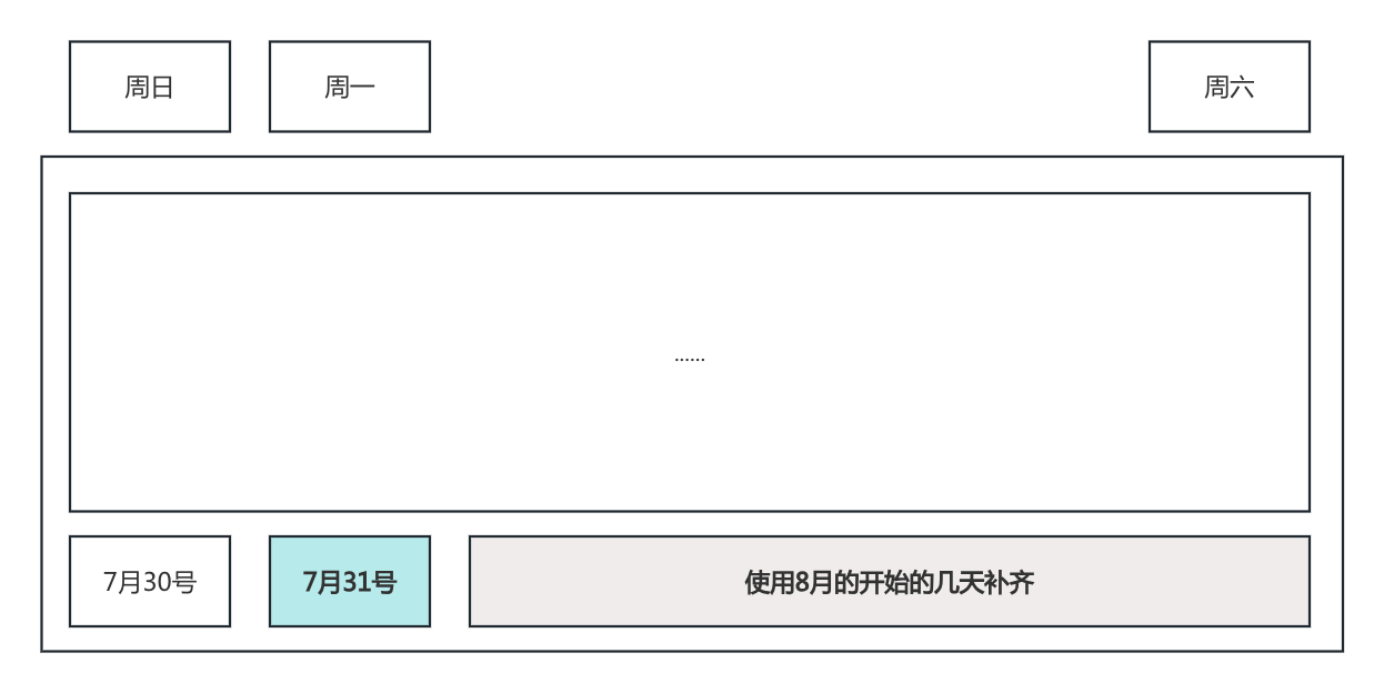const y = date[1] === 12 ? date[0] + 1 : date[0];const m = date[1] === 12 ? 1 : date[1] + 1; 接着,由于我们知道了当前月的天数和上个月补齐的天数,那么自然下个月需要补齐多少天也能算出来,42-当前月天数-上个月天数=下个月补齐天数;
