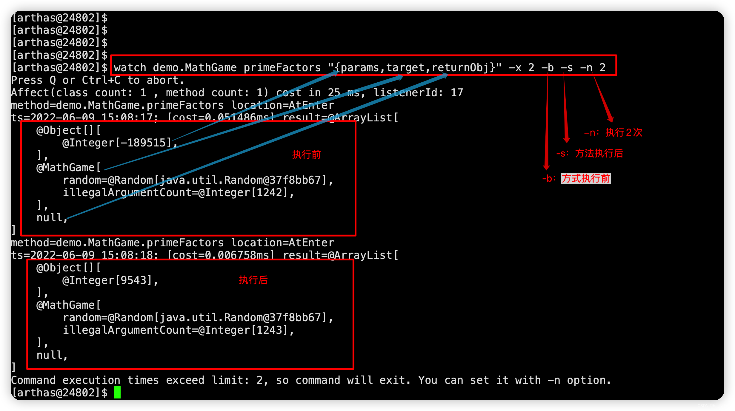 # -b 方法执行前的参数watch demo.MathGame primeFactors "{params,returnObj}" -x 2 -b