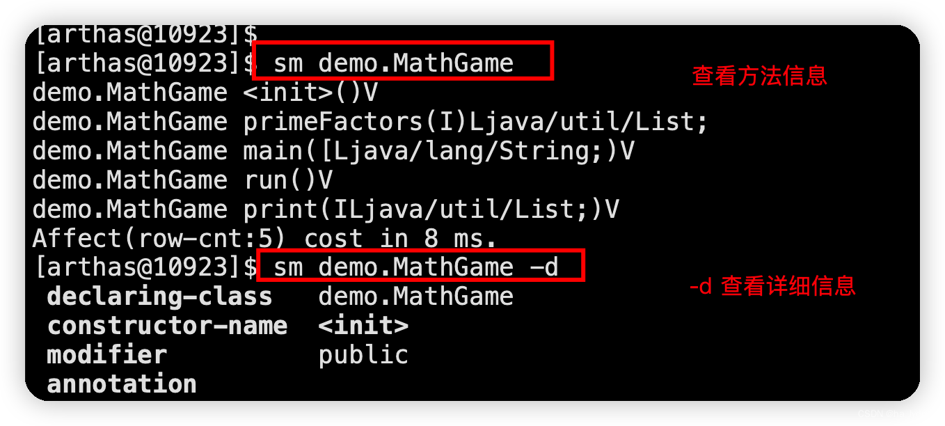 #显示String类加载的方法sm java.lang.String# 查看方法信息sm demo.MathGame# 查看方法信息(详细信息-d)sm -d demo.MathGame