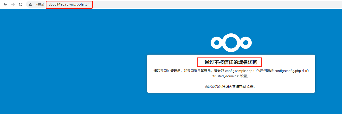 打开浏览器访问刚刚所复制的公网地址,出现以下信息:通过不被信任的域名访问。这个问题是nextcloud限制了访问的方式,只支持局域网ip进行访问