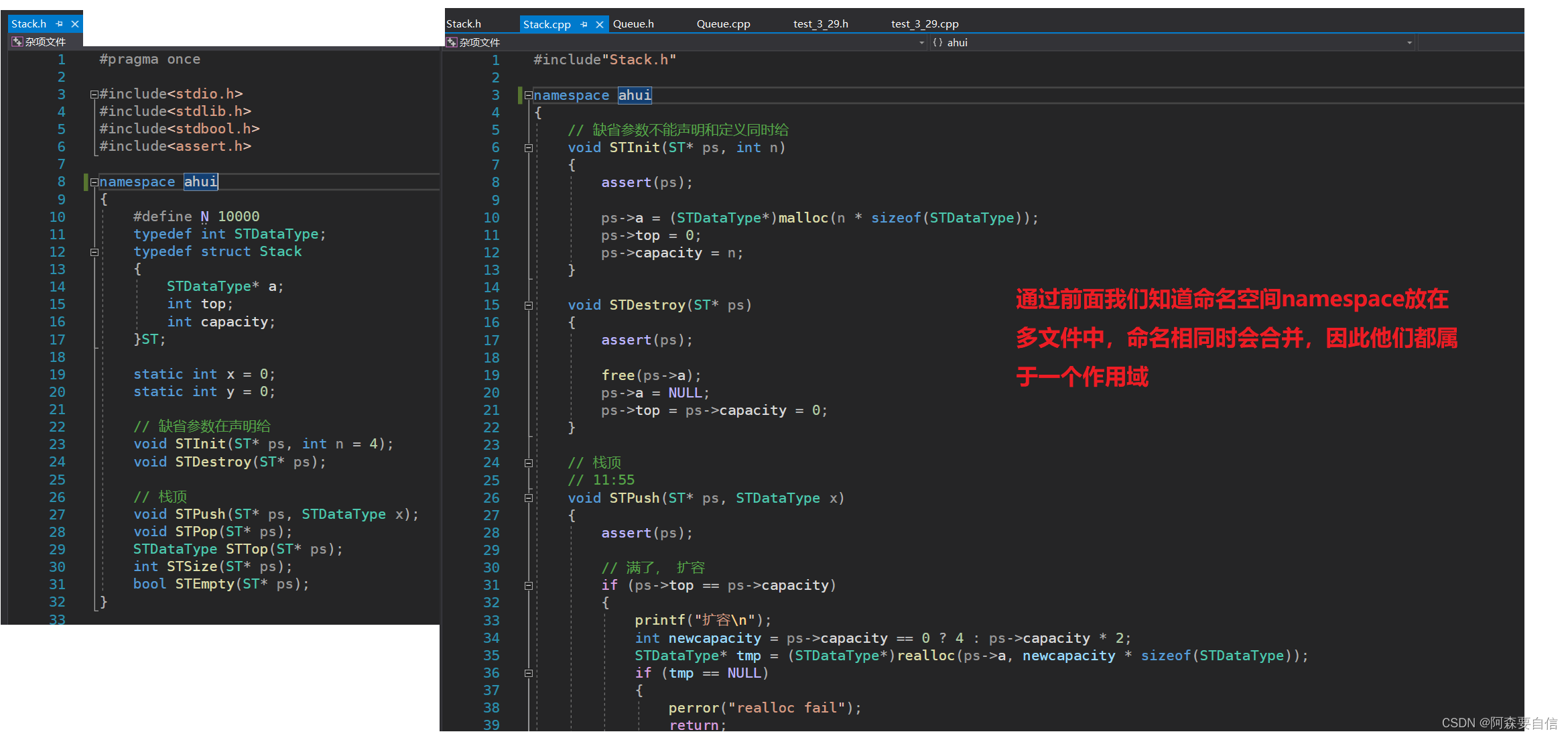 1. 正确的命名空间定义//正确的命名空间定义namespace Asen{//命名空空间中可以定义变量/函数/类型int rand = 10;int Add(int begin, int end){return begin + end;}struct Node{struct Node* next;int data;};} 命名空间可以嵌套 namespace Asen{int a;int b;int Add(int left, int right){return left + right;}namespace needs_confidence{int Sub(int begin, int end){return begin - end;}}} 同一个工程中允许存在多个相同名称的命名空间,编译器最后会合成同一个命名空间中。如:一个工程中的