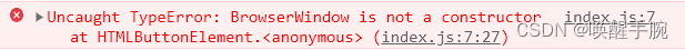 const { remote } = require('electron')window.addEventListener("DOMContentLoaded", () => { const oBtn = document.getElementById("btn") oBtn.addEventListener('click', () => { console.log("hello world") const minWindow = new remote.BrowserWindow({ width: 200, height: 150 }) minWindow.loadFile('mini.html') })}) 出现新的问题:
