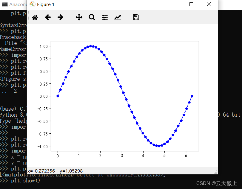 import numpy as npx = np.linspace (0 , 2*np.pi,50)#x坐标输入y = np.sin (x)#计算对应x的正弦值plt.plot(x,y, 'bp--')#控制图形格式为蓝色带星虚线,显示正弦曲线plt.show ( )