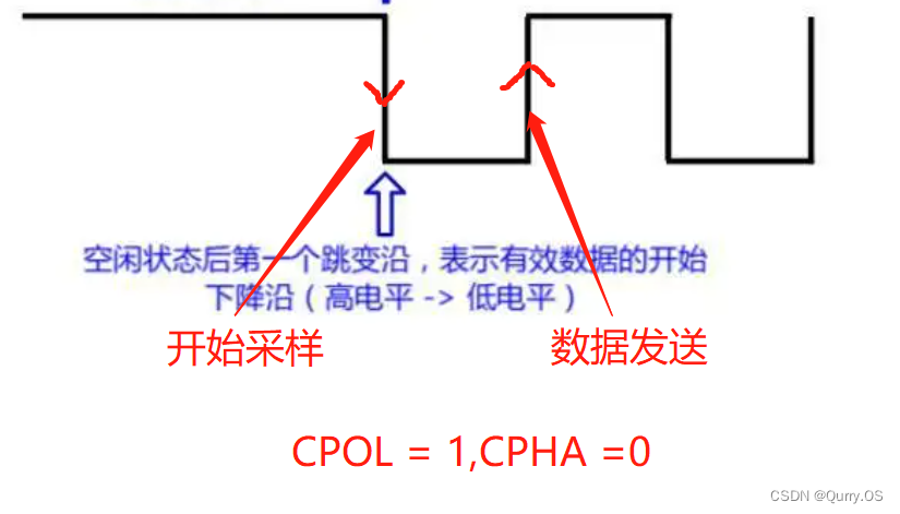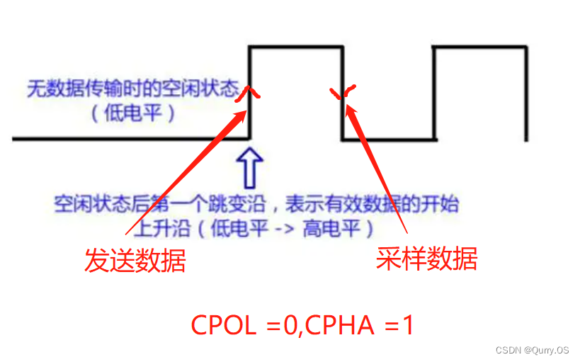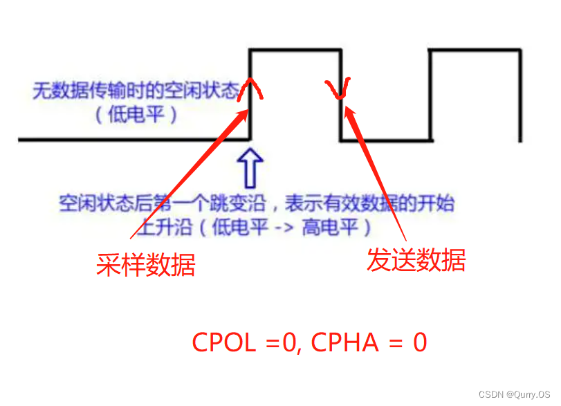 在空闲状态下,SCLK处于低电平,在第2个时钟边沿进行数据采样,第一个时钟沿进行发送数据。