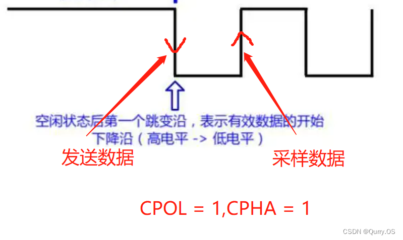 在空闲状态下,SCLK处于高电平,在第2个时钟边沿进行数据采样,第一个时钟沿进行发送数据。