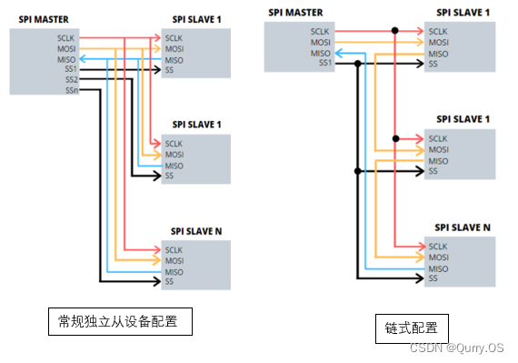 MOSI :主设备数据输出,从设备数据输入;MISO :主设备数据输入,从设备数据输出;SCLK: 主设备产生的时钟信号;CS/SS:(Chip select)由master设备控制,选择与哪个SPI从设备通信;通常设为低电平表示使能该从设备;② 支持一主多从,一个主设备控制多个从设备,通常配置为每个从设备对应一条CS线,通过拉低CS信号,选择需要通信的从设备,如果同时将两个SS信号线拉低,则可能会出现乱码,因为从机可能都试图在同一条MISO线上传输数据,最终导致接收数据乱码;