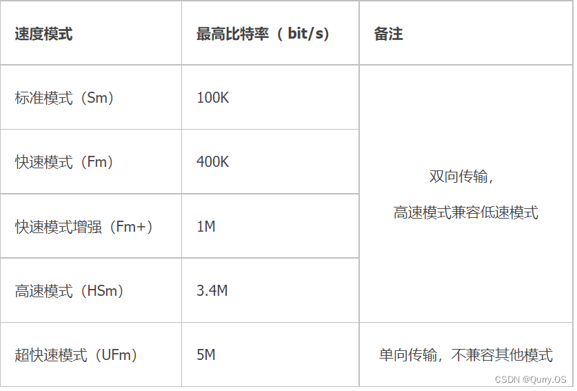 除超快速模式外,其它都是可以向后兼容的,也就是说快速模式设备向后兼容,可以与 0 至 100 kbit/s I2C 总线系统的标准模式设备通信,然而,由于标准模式设备不向上兼容,它们不能在快速 I2C 总线系统中运行。