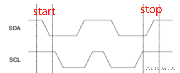 起始信号:当SCL为高电平期间,SDA由高到低电平的跳变(启动信号是一种电平跳变时序信号,而不是一个电平信号);