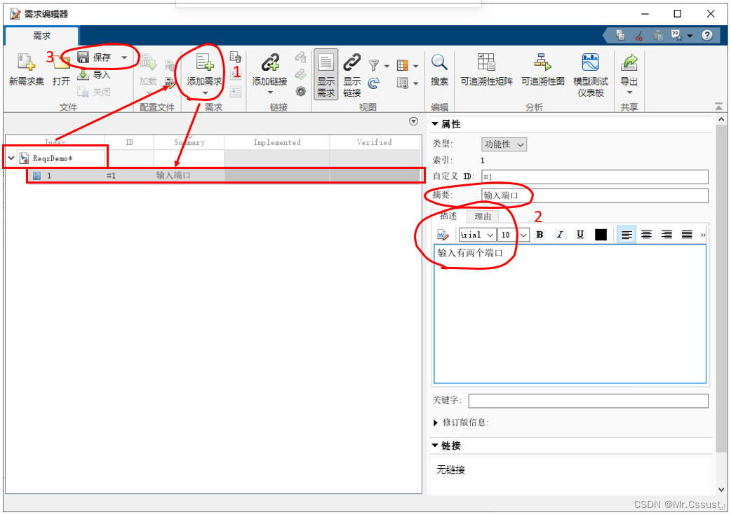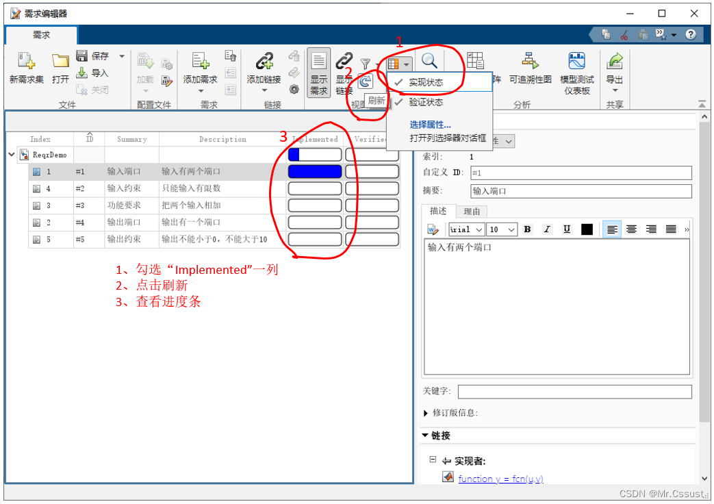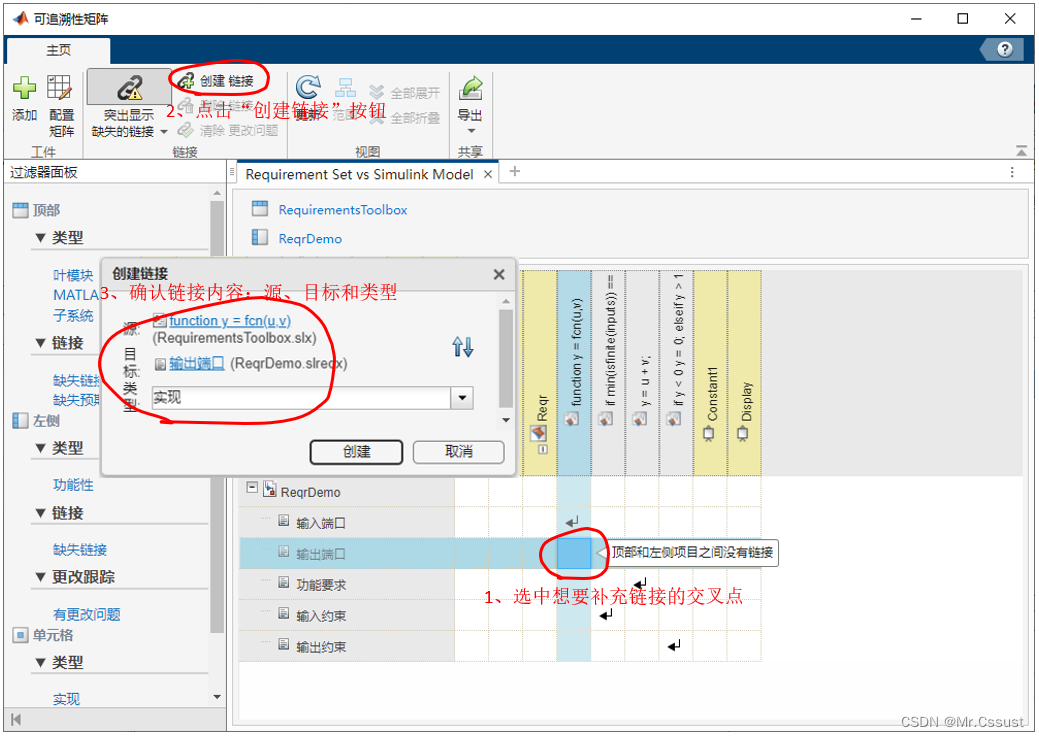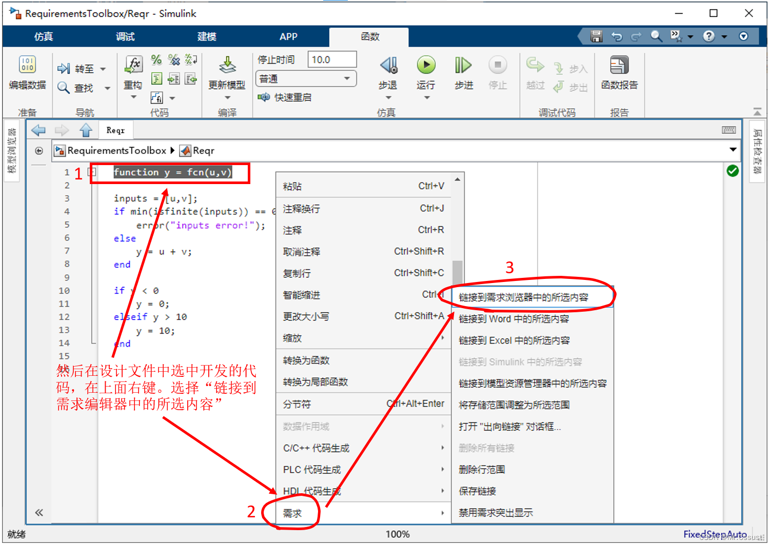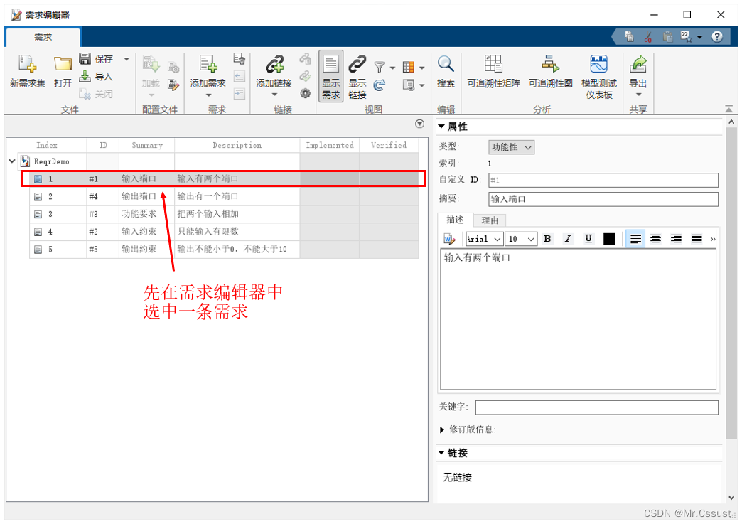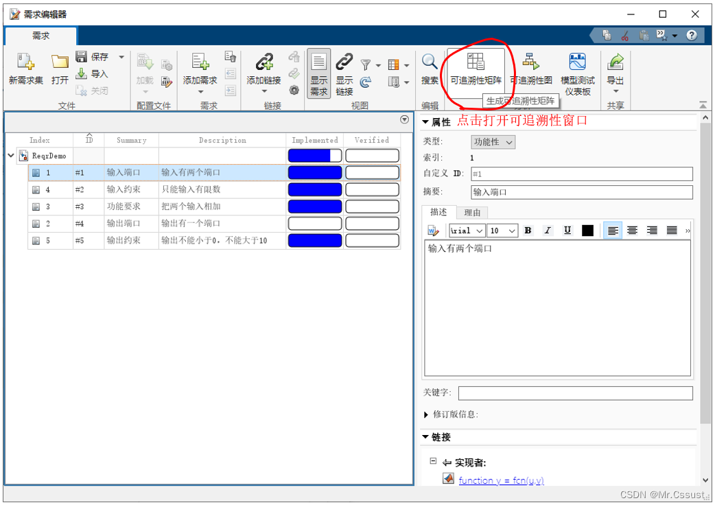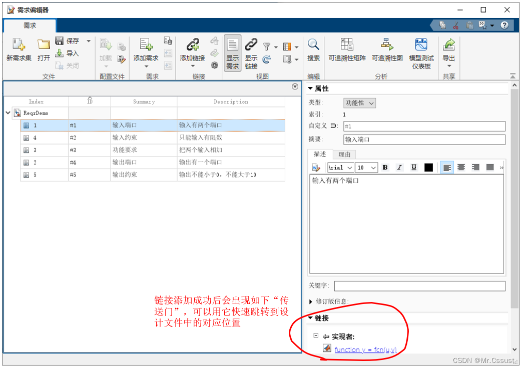 本文中建需求与设计之间建立链接的过程是1、在需求编辑器中,选中第一条需求“输入端口”。2、在MATLAB编辑器中,选择fcn函数的函数定义行。3、右键链接到需求编辑器中的所选内容。4、链接成功后就可以在需求浏览器中查看到对应链接内容,可以用于快速跳转。示例如下: