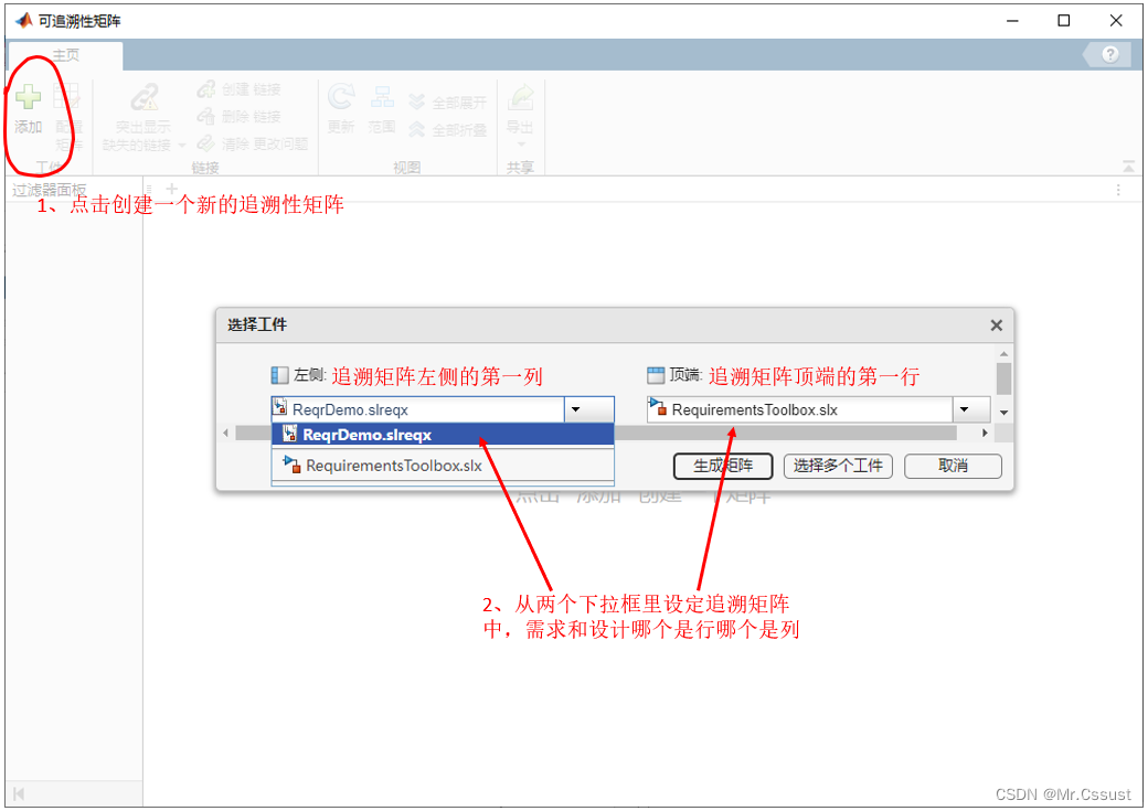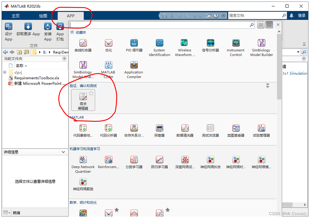 Requirements Toolbox在Matlab中的位置在App选项卡 -> 验证、确认和测试 -> 需求编辑器,示例如下: