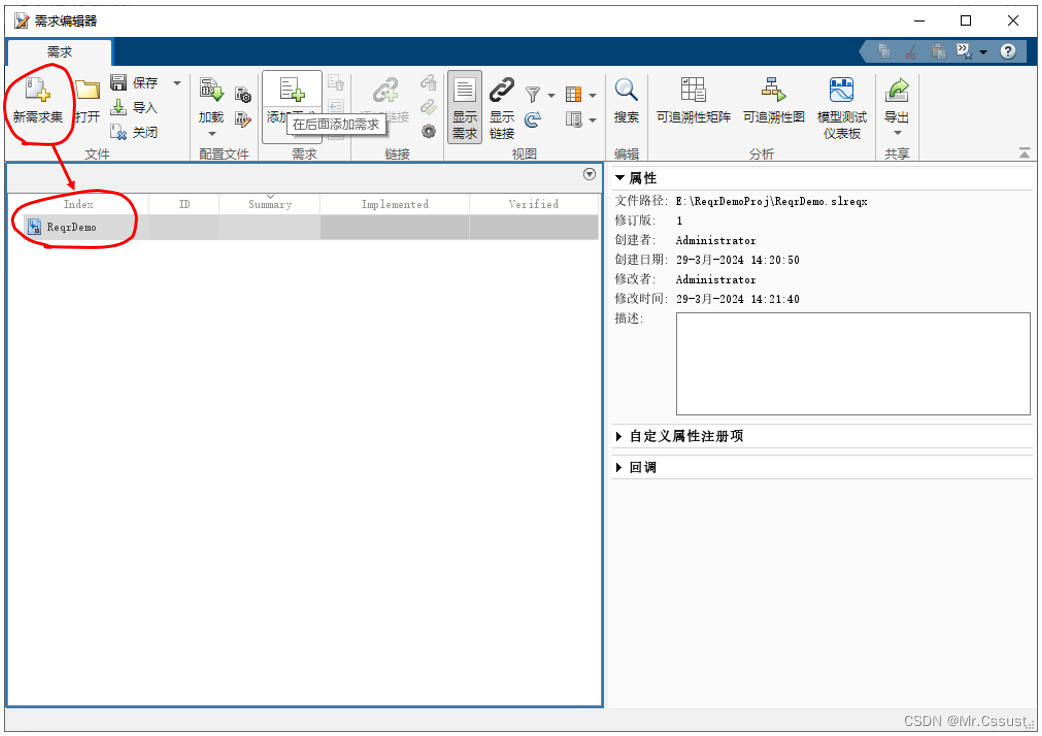 打开需求编辑器后,点击新建需求集创建一个新的需求集。将需求集命名为 ReqrDemo,然后将需求集保存在 ReqrDemoProj工程的文件夹中。示例如下: