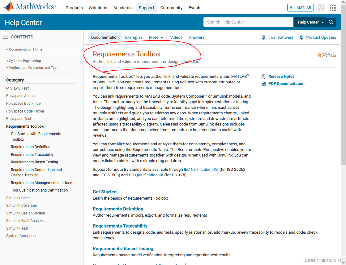Requirements Toolbox是Matlab中用来编写、链接和追溯需求的一个工具,Mathworks官方Help对该部分内容的说明如下所示: