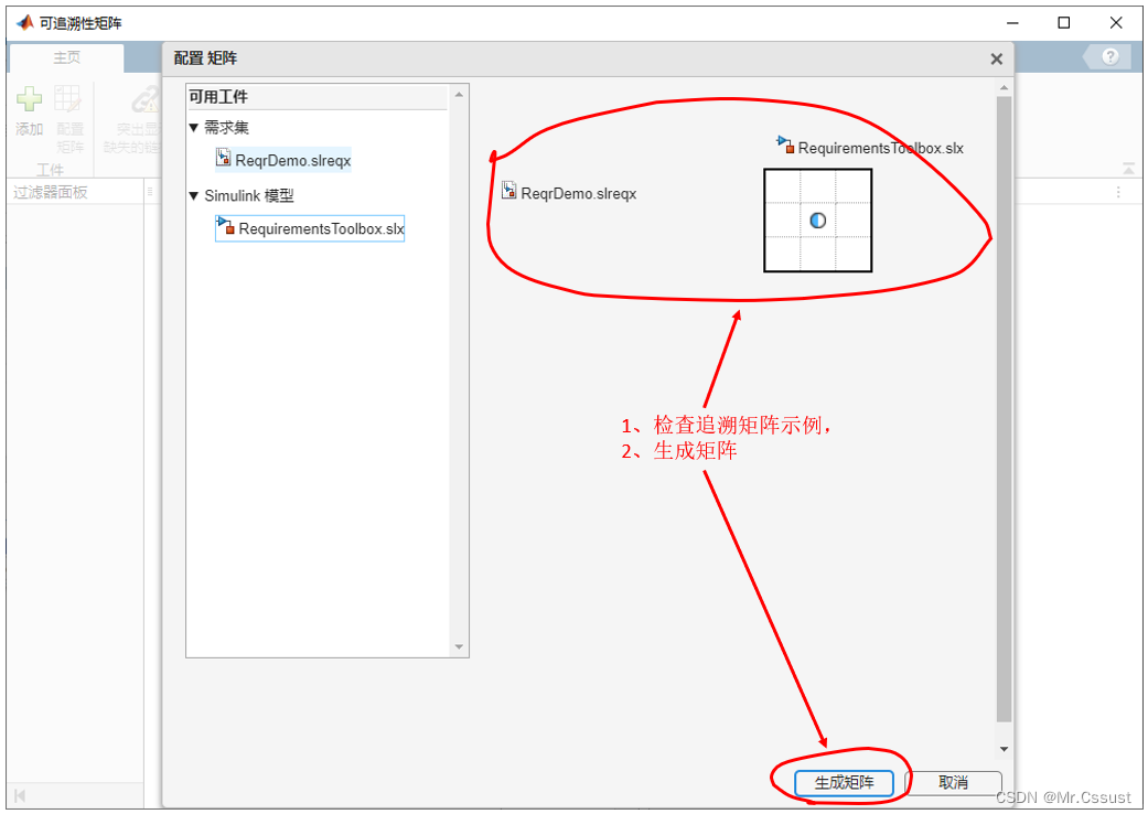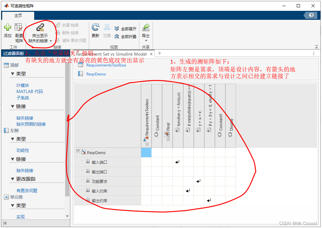 需求联接到设计文件中的代码后,Requirements Toolbox会自动分析可追溯性,并以可视化的追溯性矩阵呈现出来,显示全部工件之间存在的链接关系,可以很方便地找到有缺失的地方,指导我们消除缺失。追溯性矩阵的用法示例如下: