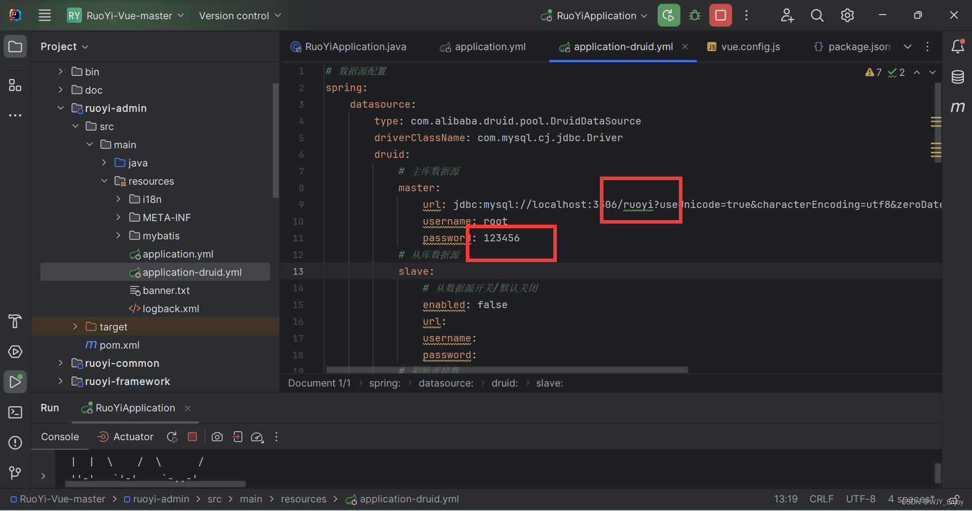 3.在E:\eclipse\spaceone\RuoYi-Vue-master\ruoyi-admin\src\main\resources\application-druid.yml修改数据库名和密码