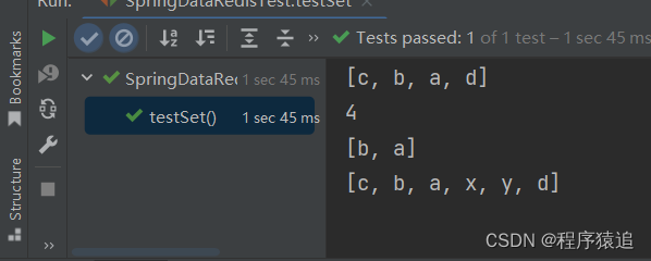 @Test public void test4(){ //sadd smembers scard sinter sunion srem SetOperations setOperations = redisTemplate.opsForSet(); setOperations.add("set1","a","b","c","d"); // 往set1 插入abcd setOperations.add("set2","a","b","x","y"); // 往set2 插入abxy Set members = setOperations.members("set1"); System.out.println(members); // 输出 Long size = setOperations.size("set1"); System.out.println(size); // 输出 Set intersect = setOperations.intersect("set1", "set2"); // 他们的交集 System.out.println(intersect); Set union = setOperations.union("set1", "set2");// 他们的并集 System.out.println(union); setOperations.remove("set1","a","b"); // 在set1里面删除ab }