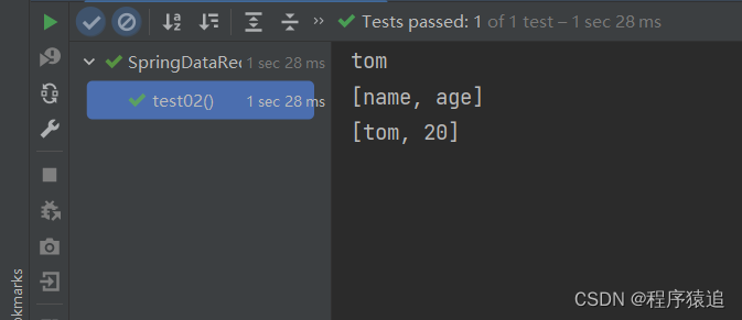 @Test public void test02(){ //hset hget hdel hkeys hvals HashOperations hashOperations = redisTemplate.opsForHash(); hashOperations.put("100","name","tom"); // 设置k为100,哈希k为name v为100 hashOperations.put("100","age","20"); String name = (String) hashOperations.get("100", "name"); // 获取k为100,hashk为name的v System.out.println(name); Set keys = hashOperations.keys("100"); // 获取k为100的集合k System.out.println(keys); List values = hashOperations.values("100"); // 获取k为100的集合v System.out.println(values); hashOperations.delete("100","age"); // 删除age字段 } 控制台输出