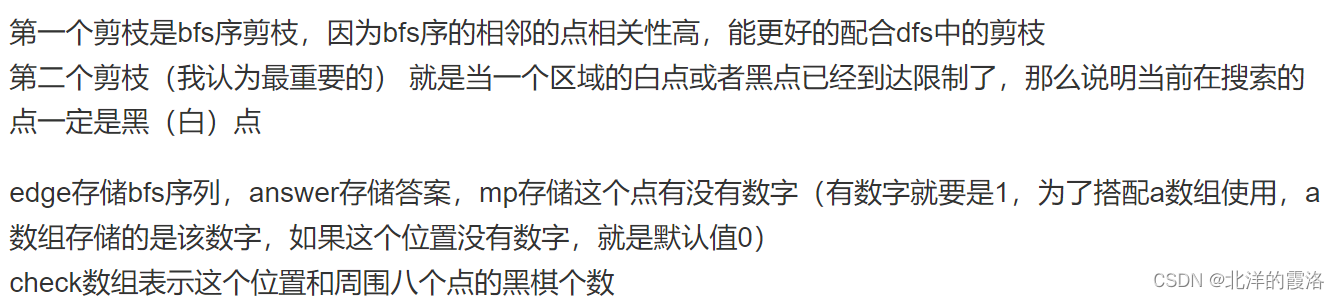 #include <iostream>#include <algorithm>#include <cstring>#include <cstdio>using namespace std;typedef long long LL;const int N = 1e5 + 10;int n;int a[N], s[N];//a[N]中每个数字都是20位的二进制数,所以区间异或和取决于同一位1的奇偶数//100分int main(){ cin >> n; for (int i = 1; i <= n; i ++ ) cin >> a[i]; for (int i = 1; i <= n; i ++ ) s[i] = s[i - 1] ^ a[i]; LL ans = 0; for (int j = 0; j < 21; j ++ ) //枚举每一位,给的Ai范围是0 ~ 2^20 { int c0 = 1, c1 = 0; //s[0]始终为0,所以多一个c0 = 1 LL now = 0; //当前位的答案 for (int i = 1; i <= n; i ++ ) if (s[i] >> j & 1) now += c0, c1 ++ ; //s[i]的第j位是1 else now += c1, c0 ++ ; //s[i]的第j位是0 ans += now * (1 << j); } cout << ans << endl; return 0;} 第九题《像素放置》【DFS+BFS+剪枝】