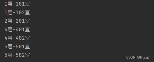 for i in range(1,6): for j in range(1,3): if i==3: continue #跳过第三层,从第四层开始 if i==2 and j==2: break #当dao2层2室的时候直接退出二层循环。从三层开始走 print(f"{i}层-{i}0{j}室")