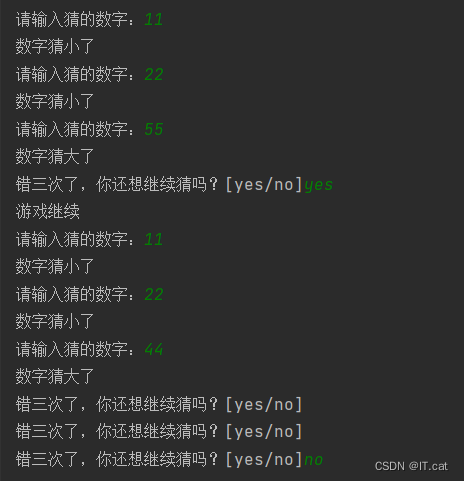 guess_age = 30guess_num=0while True: guess_num += 1 if guess_num<=3: guess = int(input("请输入猜的数字:")) if guess < guess_age: print("数字猜小了") elif guess > guess_age: print("数字猜大了") else: print("恭喜猜对了") else: choice = str(input("错三次了,你还想继续猜吗?[yes/no]")) if choice == "": continue elif choice == "yes": print("游戏继续") guess_num = 0 else: break