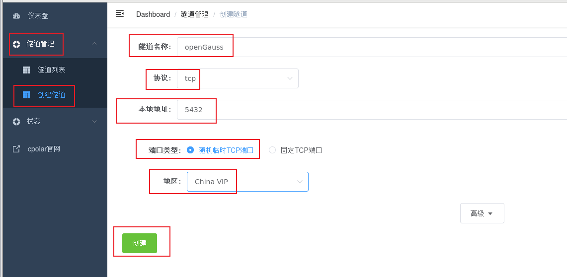 隧道名称:可自定义,注意不要与已有的隧道名称重复协议:tcp本地地址:5432 (openGauss 默认端口)域名类型:临时随机TCP端口地区:选择China VIP点击创建