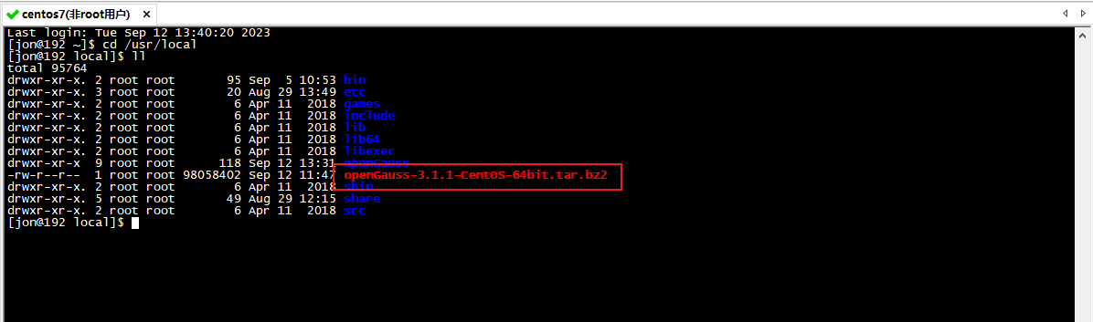 chmod 777 /usr/local/openGauss *在Linux 中切换为普通用户登录,注意,不能使用root用户进行安装openGauss,