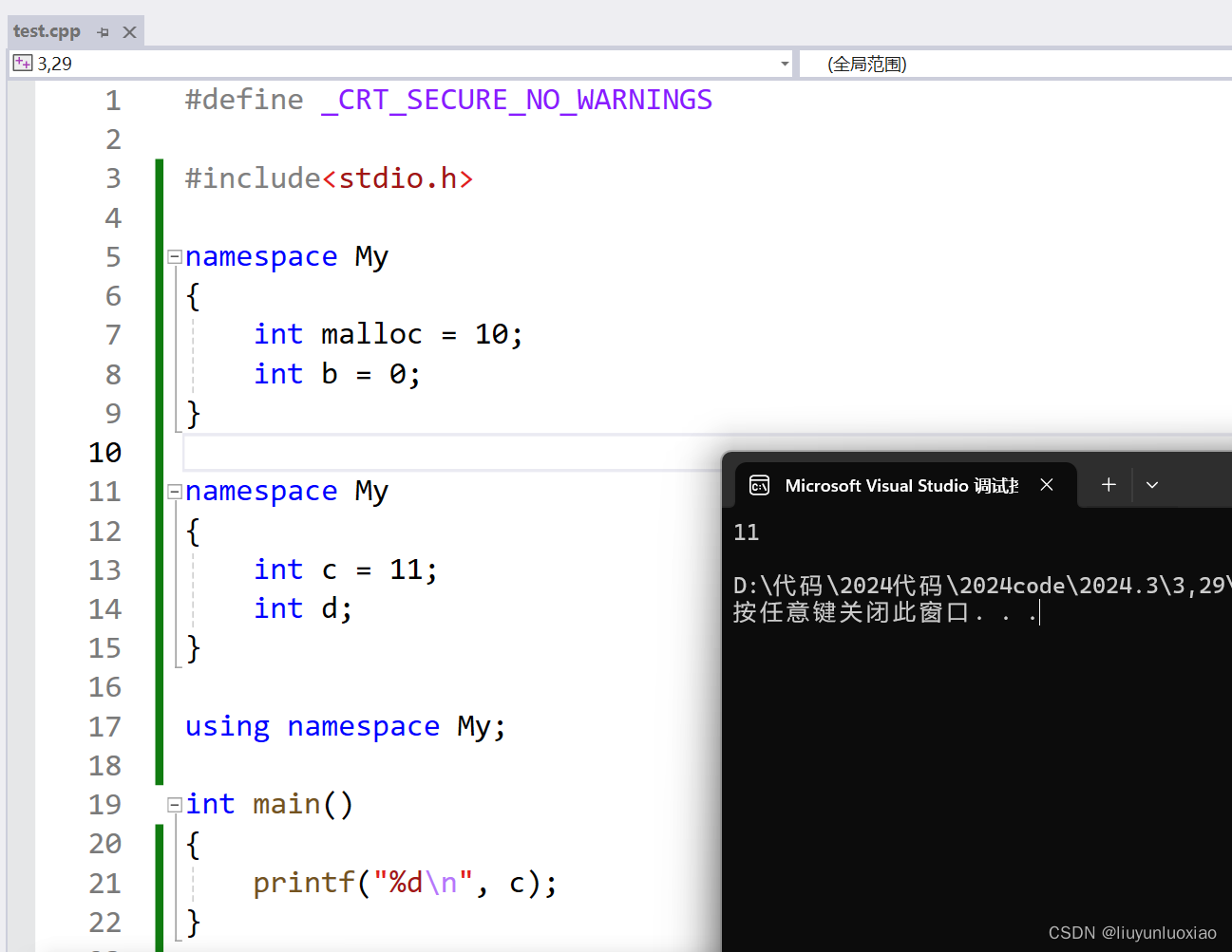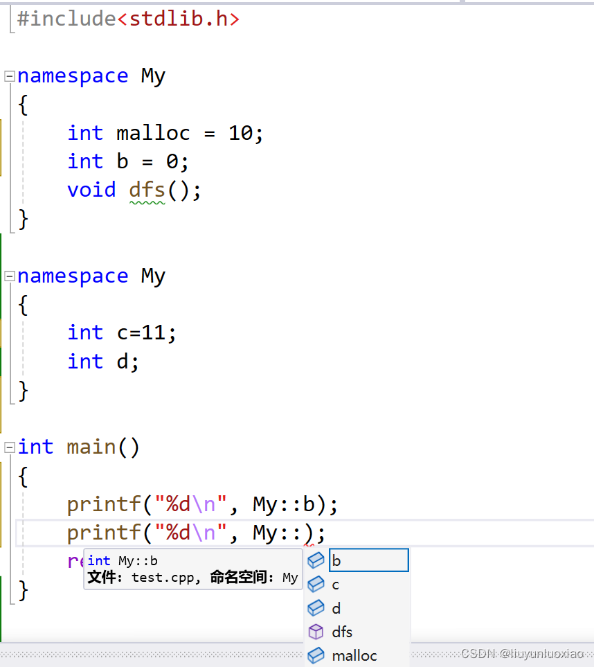 namespace My{int malloc = 10;int b = 0;void dfs();} 命名空间中可以定义很多类型的东西