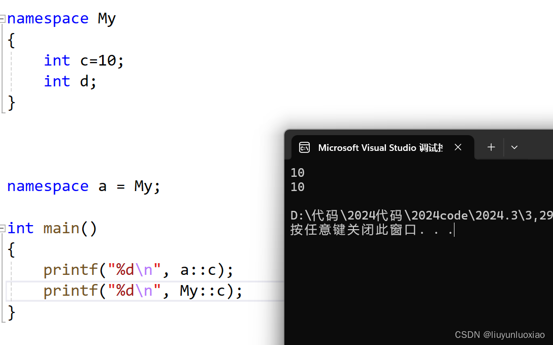 语法:命名空间关键字(namespace)+命名空间的名字+{ 定义的东西 }