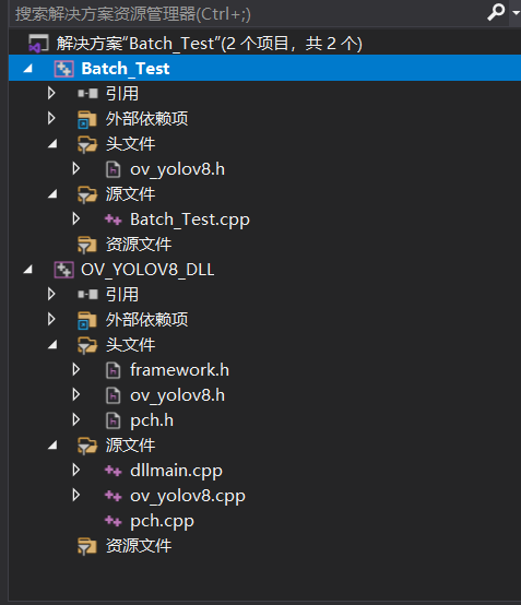 #pragma once#ifdef OV_YOLOV8_EXPORTS#define OV_YOLOV8_API _declspec(dllexport)#else#define OV_YOLOV8_API _declspec(dllimport)#endif#include <iostream>#include <string>#include <vector>#include <algorithm>#include <random>#include <openvino/openvino.hpp> //openvino header file#include <opencv2/opencv.hpp> //opencv header fileusing namespace cv;using namespace std;using namespace dnn;// 定义输出结构体typedef struct {float prob;cv::Rect rect;int classid;}Object;//定义类class OV_YOLOV8_API YoloModel{public:YoloModel();~YoloModel();//检测bool LoadDetectModel(const string& xmlName, string& device);bool YoloDetectInfer(const Mat& src, double cof_threshold, double nms_area_threshold, Mat& dst, vector<Object>& vecObj);//分类bool YoloClsInfer(const Mat& src, double cof_threshold, double nms_area_threshold, Mat& dst, vector<Object>& vecObj);bool LoadClsModel(const string& xmlName, string& device);//分割bool LoadSegModel(const string& xmlName, string& device);bool YoloSegInfer(const Mat& src, double cof_threshold, double nms_area_threshold, Mat& dst, vector<Object>& vecObj);//姿态bool LoadPoseModel(const string& xmlName, string& device);bool YoloPoseInfer(const Mat& src, double cof_threshold, double nms_area_threshold, Mat& dst, vector<Object>& vecObj);private:ov::InferRequest infer_request_Detect;ov::CompiledModel compiled_model_Detect;ov::InferRequest infer_request_Cls;ov::CompiledModel compiled_model_Detect_Cls;ov::InferRequest infer_request_Seg;ov::CompiledModel compiled_model_Seg;ov::InferRequest infer_request_Pose;ov::CompiledModel compiled_model_Pose;//增加函数 // Keep the ratio before resizevoid letterbox(const Mat& source, Mat& result);void sigmoid_function(float a, float& b);void plot_keypoints(cv::Mat& image, const std::vector<std::vector<float>>& keypoints, const cv::Size& shape);}; 2.Batch_Test