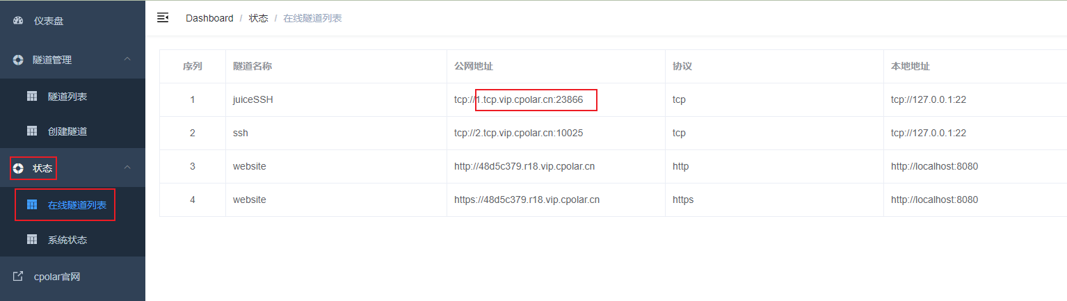 隧道更新成功后,点击左侧仪表盘的状态——在线隧道列表,可以看到公网地址已经更新成为了固定tcp地址。