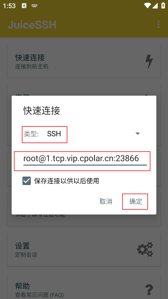 固定好了地址后,我们打开JuiceSSH ,使用我们固定的地址进行连接,同样输入的时候按照:用户名@cpolar地址格式进行输入,输入完成点击确定