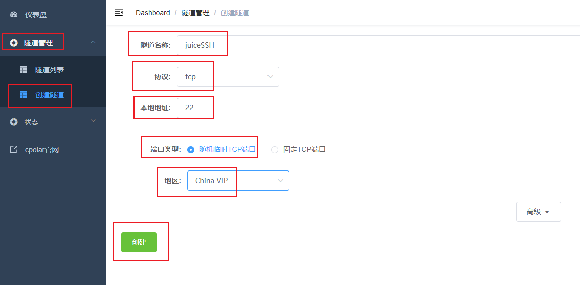 隧道名称:可自定义,注意不要与已有的隧道名称重复协议:tcp本地地址:22域名类型:临时随机TCP端口地区:选择China VIP点击创建