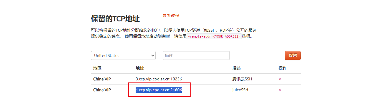 要注意的是,以上步骤使用的是随机临时tcp端口地址,所生成的公网地址为随机临时地址,该公网地址24小时内会随机变化。我们接下来为其配置固定的TCP端口地址,该地址不会变化,设置后将无需每天重复修改地址。