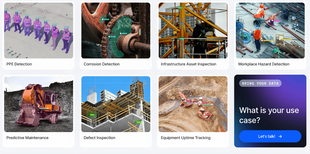 Aerial Crop Analysis(航拍作物分析):图中展现了一片农田,通过无人机或航拍获得的影像,可能用于分析作物生长情况或土壤状况。Automated Vegetable and Fruit Picking(自动化蔬菜水果采摘):这张图片显示了一个机械装置正在挑选或采摘一个绿色的果实,代表现代化自动采摘技术。Grading and Sorting(分级和分类):此图描绘了一堆绿色的苹果,通过自动化系统进行分级和分类,以满足市场对质量和尺寸的需求。Livestock Monitoring(畜牧监控):这张图片展现了采用跟踪技术实时监控放牧牲畜的场景,有助于管理畜群健康和位置。Pest Detection(害虫检测):图中通过使用无人机进行植物保护,检测和监控害虫的存在。Yield Estimation(产量估计):此图显示了一串葡萄并点标了数量,暗示使用图像识别技术来估算作物的预期产量。Plant Disease Detection(植物病害检测):一张描绘患病植物叶片的图片,上面标识了病斑,表明通过图像分析技术可以辨识病害。最后一个方格是蓝底白字的宣传口号 "BRING YOUR DATA What is your use case? Let's talk"(带来你的数据,你的用例是什么?我们来交流),可能意在邀请用户探讨数据处理或自定义应用案例的可能性。利用先进的成像技术和数据分析工具,可以显著提升农业生产的效率和智能化水平,包括作物监测、自动化采摘、产品分级、畜牧管理、害虫侦测、产量预测及病害诊断等。这些都是感知智能技术在农业中的实际和潜在应用场景。