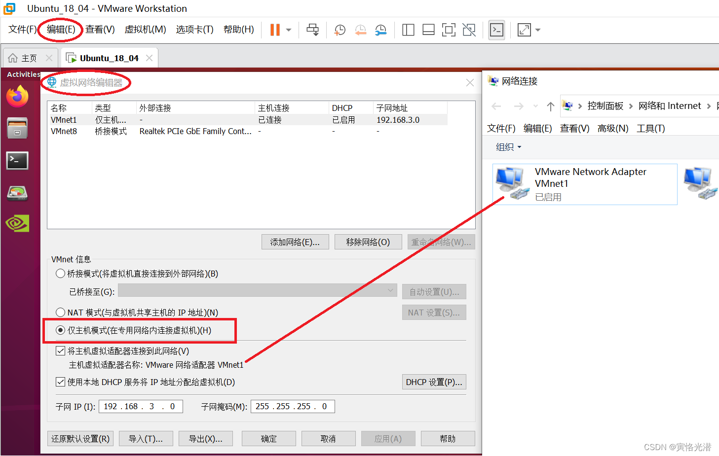 上面的NAT模式,IP地址不能更改也不能更改DHCP分配IP地址的范围,所以更灵活的是配置“仅主机模式” ,勾选“将主机虚拟适配器连接到此网络”以及“使用本地DHCP服务将IP地址分配给虚拟机”如下图: